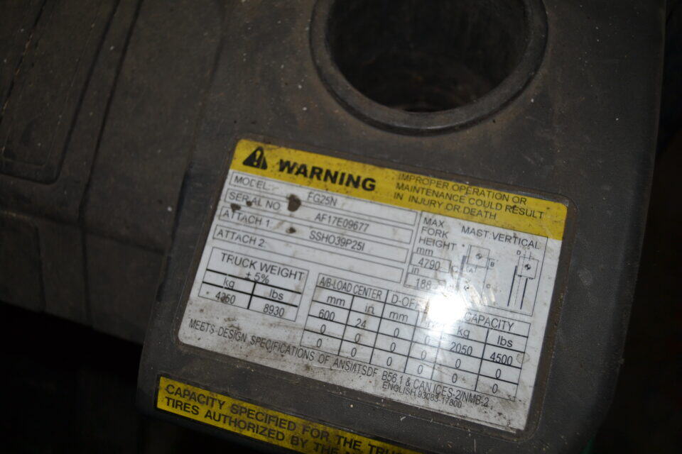 -MITSUBISHI MODEL FG25N WAREHOUSE FORKLIFT W/SIDE SHIFT W/PROPANE ENGINE SN#AF17E09677