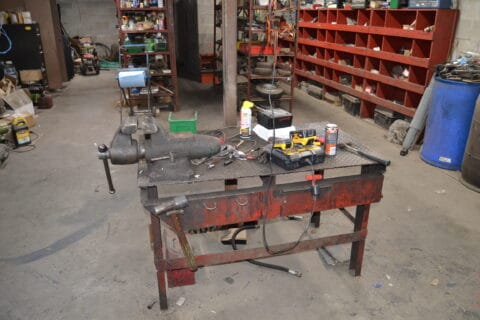 -LOT OF STEEL W/STEEL CUTTER W/MILLING MACHINE W/TOOLING SHOP TABLE W/VISE & DRILL PRESS W/HAND TOOLS