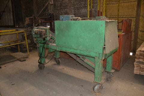 -2 SAW DOUBLE END TRIMMER W/INFEED TRANSFER W/BLOCK CONVEYOR W/DRIVE