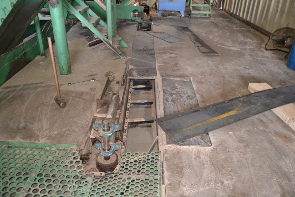 -CUSTOM BUILT SPLITTER SAW W/INFEED LOG DECK W/OUTFEED TRANSER DECK W/SLAB DECK W/ WASTE CONVEYOR W/ DRIVES